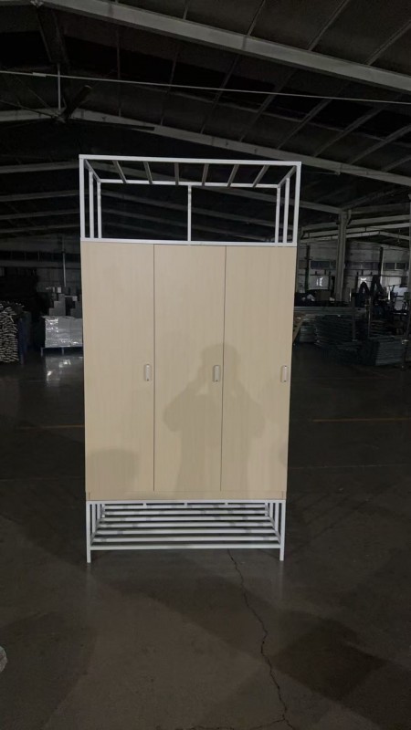 7、雙層鞋架:外形尺寸:1725*420*290mm與床體配套。全部使用20*20*1.2mm厚的方形鋼管整體焊接成為一體,正面和背面用一根數(shù)控彎折鋼管和2根方管作為立管,再用8根方管作為橫拉管使正、背面焊接起來;使用4根方管作為橫拉管均布在底部并使用5根方管作為橫拉管均布在中部;整體與下床床挺螺栓連接,方便拆裝及衛(wèi)生清理。鞋架外側(cè)帶3扇上掀起的鋼制門,鋼板厚0.7mm,拉手采用一體成型結(jié)構(gòu)。